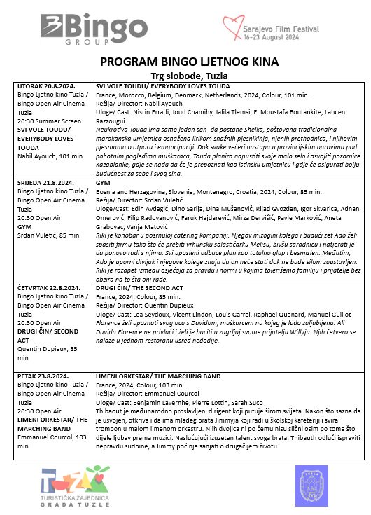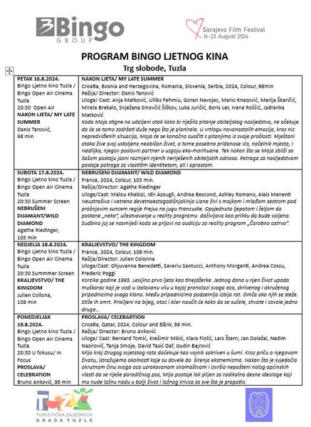 Čarolija filmske umjetnosti pod otvorenim nebom stiže sutra i u Tuzlu. Bingo, mjesto susreta 500.000 ljudi dnevno širom BiH, sada je i mjesto susreta ljubitelja filma. U saradnji sa Sarajevo Film Festivalom, vodeća poslovna grupacija u BiH donosi festivalsku atmosferu na Trg Slobode u Tuzli.